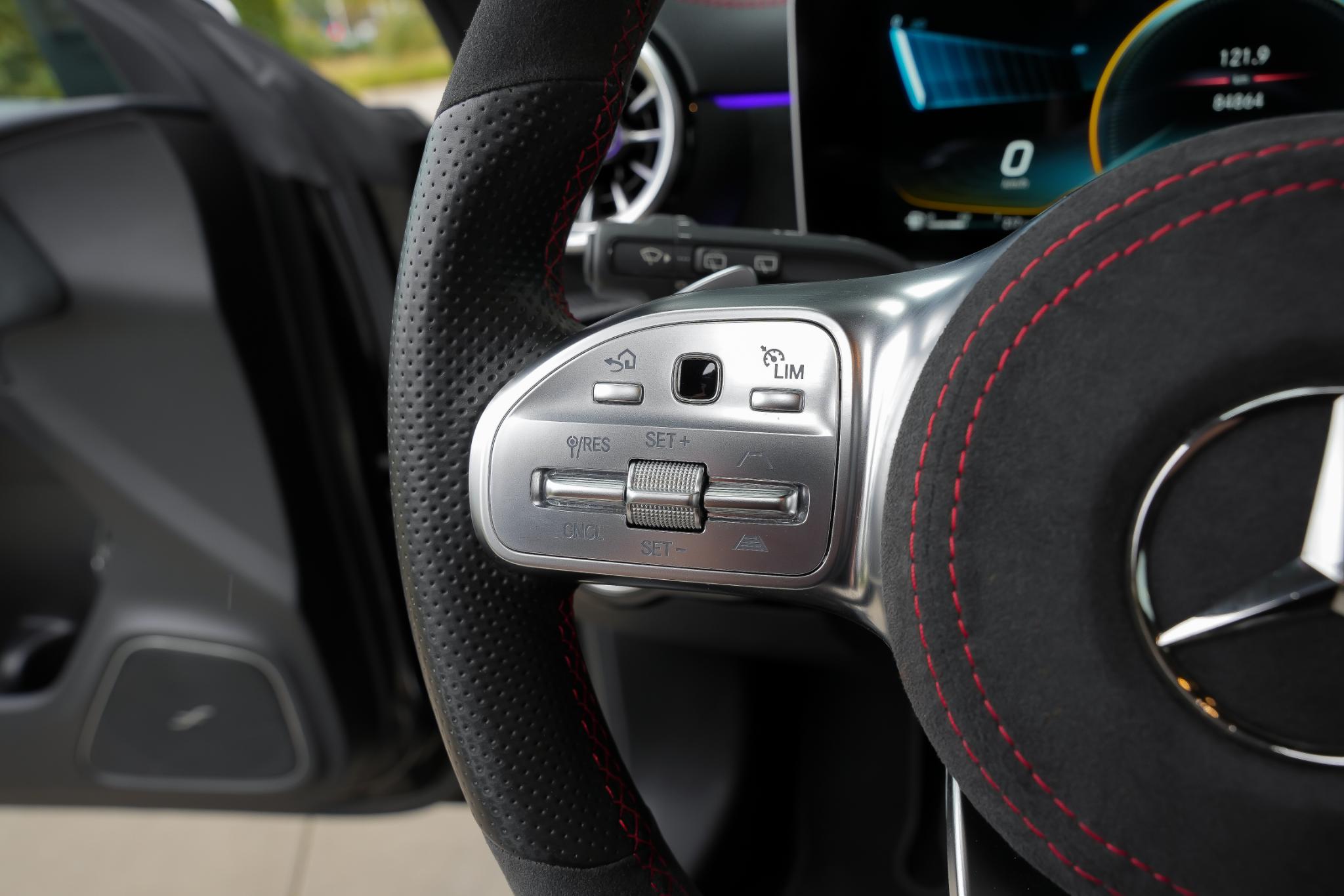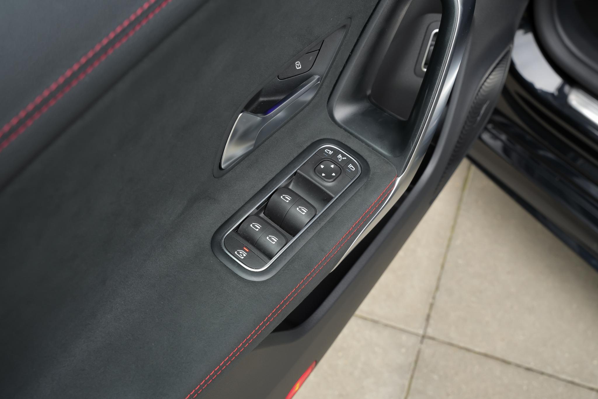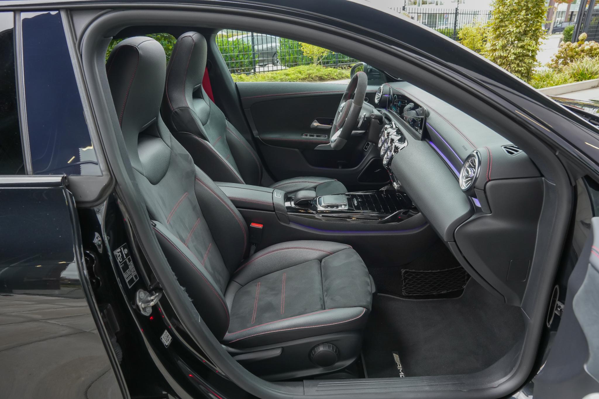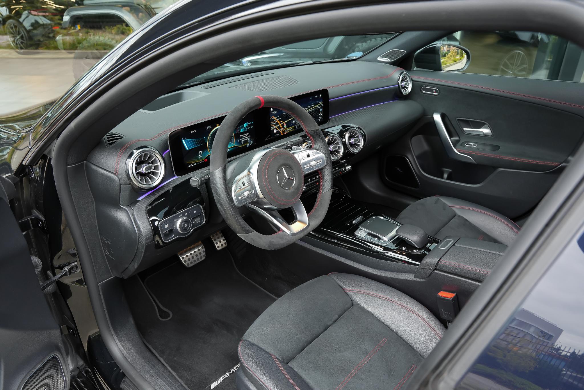 Binnenin is dezelfde sportieve lijn doorgetrokken. Het AMG-sportstuur met lederen bekleding en rode veiligheidsgordels geven direct een dynamisch gevoel. De stoelen zijn bekleed in een hoogwaardige mix van stof, kunstleder en microvezel in zwart/antraciet, en voorzien van stoelverwarming voorin en het stoelcomfortpakket voor extra ondersteuning. Sfeerverlichting, een zwarte hemelbekleding en AMG-vloermatten maken het interieur helemaal af.